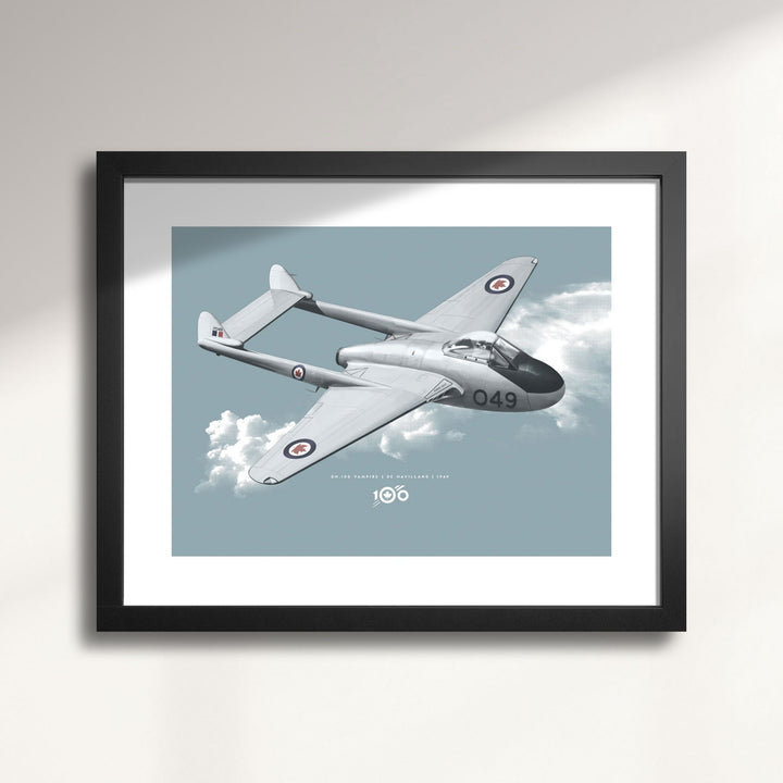 This limited edition fine art print featuring the DH-100 Vampire (circa 1946)—and our entire RCAF 100th Centennial Collection—is perfect for collectors and aviation enthusiasts of all ages. By purchasing this, you will also be supporting the RCAF and its personnel, as a portion of the proceeds will be donated to the RCAF Centennial Fund.