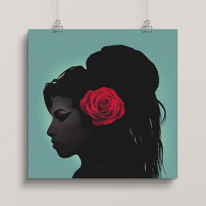 This piece captures Amy's soulful look, distinctive eyes, and signature red rose in her hair. It makes a great addition to any fan's collection or any art lover that appreciates musically-inspired artwork for their home decor.