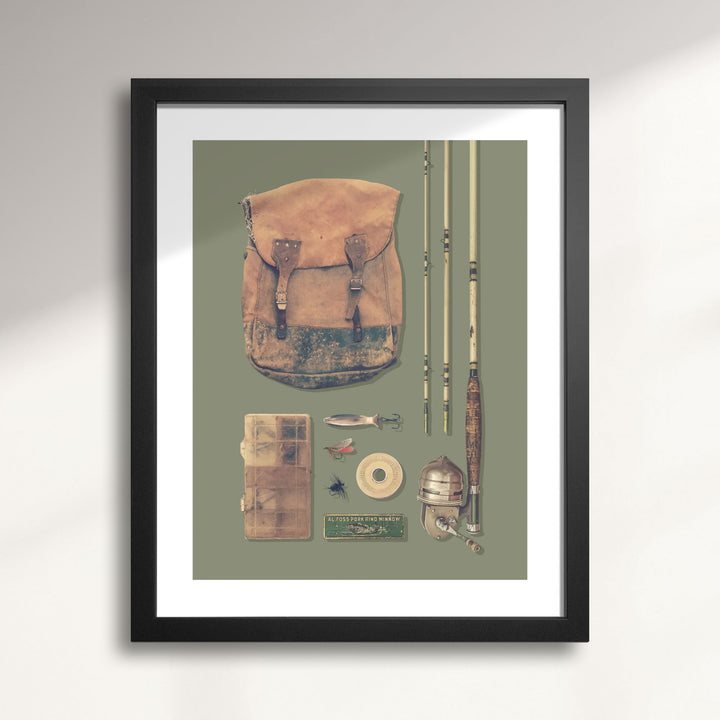 - Photorealistic Fine Art Print: A highly detailed, true-to-life illustration featuring vintage rods, reels, tackle, and gear.