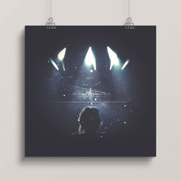 One summer evening while waiting for the band Blue Rodeo to take the stage I snapped this photo of the stage setup and lighting. When I got home I noticed a young woman had stepped into my shot. I thought it was a "strange and beautiful" coincidence, and with a little editing magic, she was incorporated as the focal point of the piece.