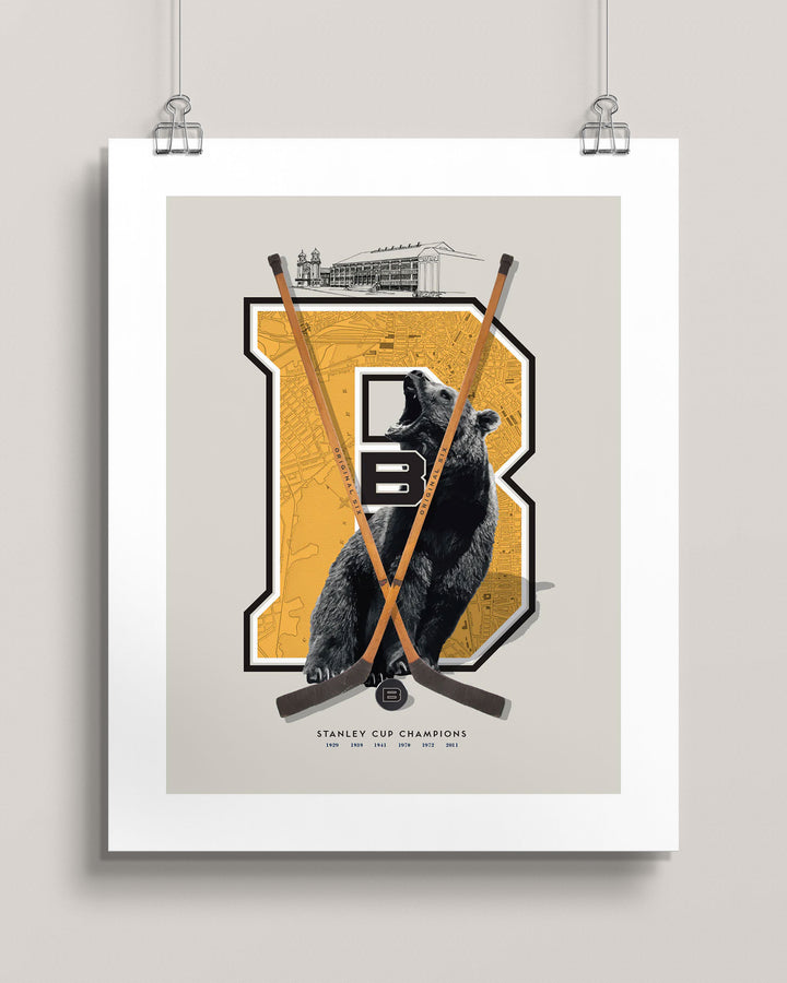 This piece was created for passionate fans who appreciate the roots of Boston hockey and its enduring legacy. The design blends a modern aesthetic with heritage-inspired elements, featuring a photo illustration of the old Boston Garden, antique hockey sticks, an illustration of a bear, and a detailed antique map of Boston. It’s a tribute to a team and a city where toughness, pride, and tradition run deep.