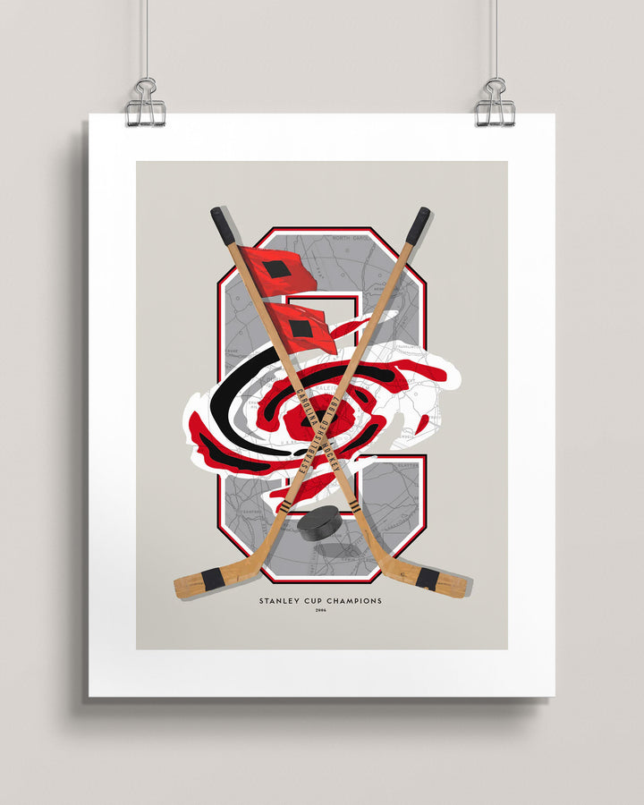 This piece was created for fans who appreciate the journey from New England roots to Southern triumph. The design blends modern style with heritage-inspired elements, featuring a pair of hurricane warning flags, a weather radar image of a hurricane stylized to echo the team's logo, antique hockey sticks, and a vintage map of the Raleigh-Durham area. It’s a tribute to the storm of passion that hockey stirred up in Carolina.