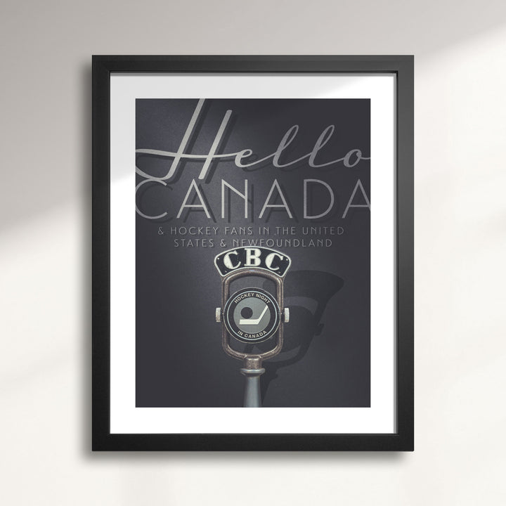 Before the drop of the puck, Foster Hewitt dropped a line that became legendary across North America. Our Hello Canada art print captures that timeless broadcast moment with a 1930s-era CBC microphone, reimagined with the vintage Hockey Night in Canada logo integrated into the grill. Behind it, Hewitt’s iconic intro—“Hello Canada and hockey fans in the United States and Newfoundland”—is stylized in dramatic, 1930s-era movie title typography, paying tribute to the golden age of radio and the voice that united a nation.