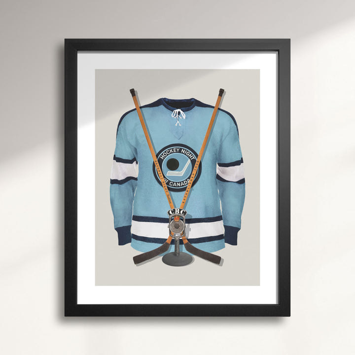 There’s nothing like a classic hockey sweater to stir up Saturday night memories. Our Hockey Night in Canada Vintage Jersey art print features a beautifully detailed vintage illustration of an old-school wool version, complete with a retro Hockey Night in Canada crest at its heart. Flanked by weathered wooden sticks etched with a nod to HNIC’s 1931 debut, and subtly paired with a 1930s-era CBC microphone, this piece honours Canada’s most enduring weekend ritual in true vintage style.