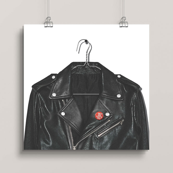 In this piece, Joey's signature leather jacket creates a sense of loss as it hangs on a bare wall. The band's anthem, "Hey Ho, Let's Go," tucked onto a small red button, counters the emotion and says, "Don't worry, I'll Be OK."