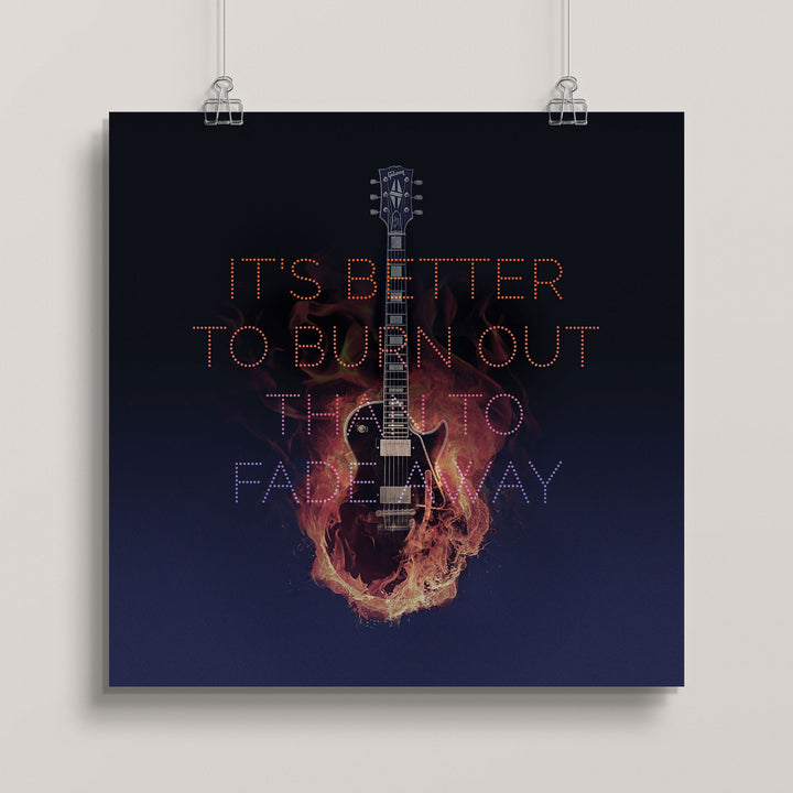 Our 'Hey Hey, My My' art print captures the spirit of Neil Young's classic rock anthem from his 1979 album, Rust Never Sleeps. Some say the song is a characterization to the chaotic life and death of the Sex Pistols' Johnny Rotten contrasted against the decline of Elvis Presley before his. Young himself was quoted as saying his song is a general comment on rock music‚"The essence of the rock'n'roll spirit to me, is that it's better to burn out really bright than to sort of decay off into infinity...Rock'n'roll is right now. What's happening right this second."