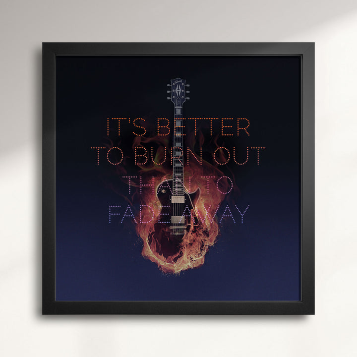 Our 'Hey Hey, My My' art print was inspired by Young's grinding guitar riffs throughout the track. The focal point of the design is his signature axe—a black Gibson Les Paul—engulfed in flames. His famous lyric is set in typography that mimics marquis lights. These gradually fade away as the flames envelope his guitar.