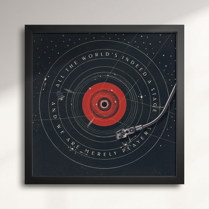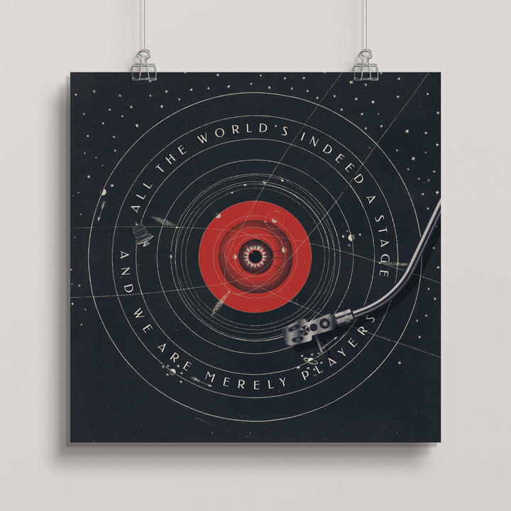 Our 'Limelight' art print was inspired by the song’s lyrical themes and the band's brand. The concept spins around creating a paradox between bygone eras and modern times. Vinyl LPs were the primary medium during Rush’s rise to fame. When we saw this antique drawing of the solar system, the orbital rings immediately inspired the idea of grooves on an LP. The illustration also brought to mind recurring celestial themes found in Rush’s music. The centre of the print features an antique illustration of an eye which references the 'fish-eye' and 'camera eye' lyrics on a red disk meant to emulate the circular label on the centre of an LP. An illustration of a gilded cage floats in the outer reaches of the solar system. The vinyl LP concept is completed by the inclusion of an illustrated record player tonearm.