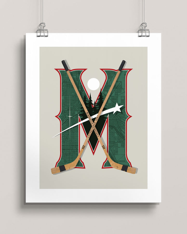 This piece was designed for fans who live and breathe hockey the way Minnesotans do. The artwork blends a modern, clean style with nods to the state's natural beauty and hockey history. Featuring silhouetted coniferous trees against a moonlit winter sky, antique hockey sticks, and a vintage map of the Minneapolis–St. Paul area, it captures the spirit of hockey’s home in America.