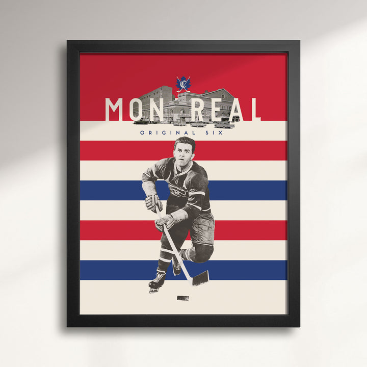 This piece was created for fans who appreciate the deep roots of professional hockey and the players who made it legendary. The design of our Montreal Canadiens Six Hockey art print series is inspired by the bold, iconic work of Depression-era graphic designer Lester Beall. His clean, timeless style rose to prominence as professional hockey was gaining ground across North America. Each piece in the series honours hockey history by blending vintage elements with images of the game's greats.