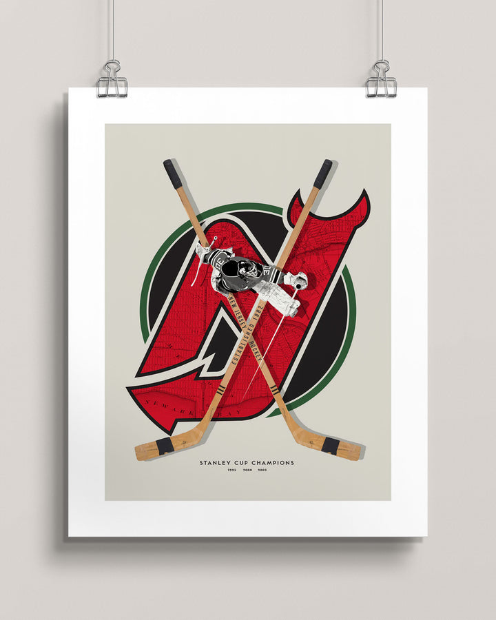 This piece was created for fans who appreciate the history and heart behind New Jersey hockey. The design blends clean, modern aesthetics with heritage elements, including a photo illustration of Martin Brodeur—arguably the franchise’s greatest player—paired with antique hockey sticks and a vintage map of Newark. It’s a tribute to the grit, tradition, and championship pedigree that defines New Jersey hockey.