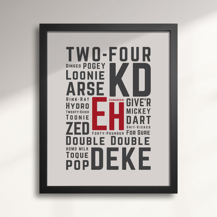 Every country has its own linguistic fingerprint—but up here in the Great White North, ours comes with extra vowels, polite disclaimers, and more than a few head-scratching slang words. Our Canadianisms art print is a cheeky celebration of the expressions only true Canucks fully understand. From “toque” to “two-four,” “KD” to “pogey,” it’s a word salad best served with maple syrup and a sense of humour.