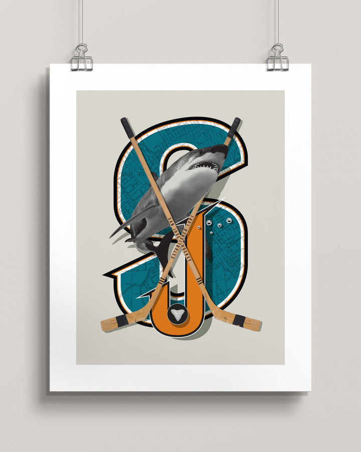 This piece was created for fans who appreciate how hockey made its comeback in the Bay Area. The design blends a clean, modern style with heritage elements, featuring an antique map of San Jose from the late 1800s, mercury drops to honour the region’s gold and mercury mining history, a pair of vintage hockey sticks, and a photo illustration of a Great White Shark. It’s a tribute to the fierce spirit and deep roots that make San Jose’s hockey culture truly unique.