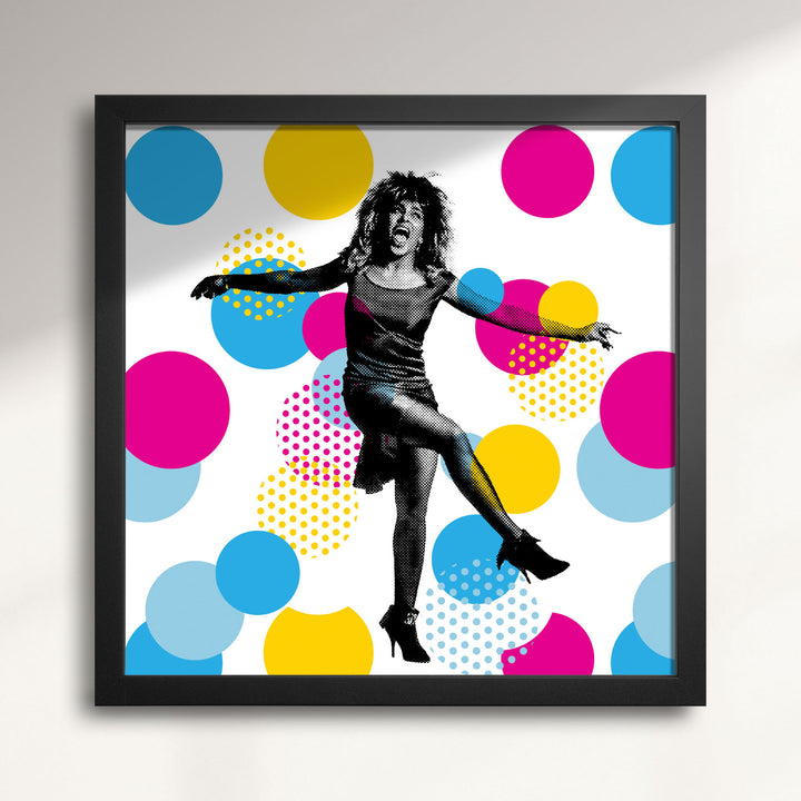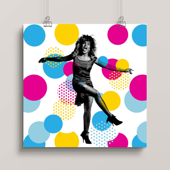 This vibrant art print captures Tina Turner in her element—bold, dynamic, and unstoppable. Set against an 80s-inspired polka dot backdrop, the piece mirrors the high-energy, electrifying stage presence that made her an icon. The pose is pure Tina: full of movement, attitude, and that signature fire that could light up any arena.