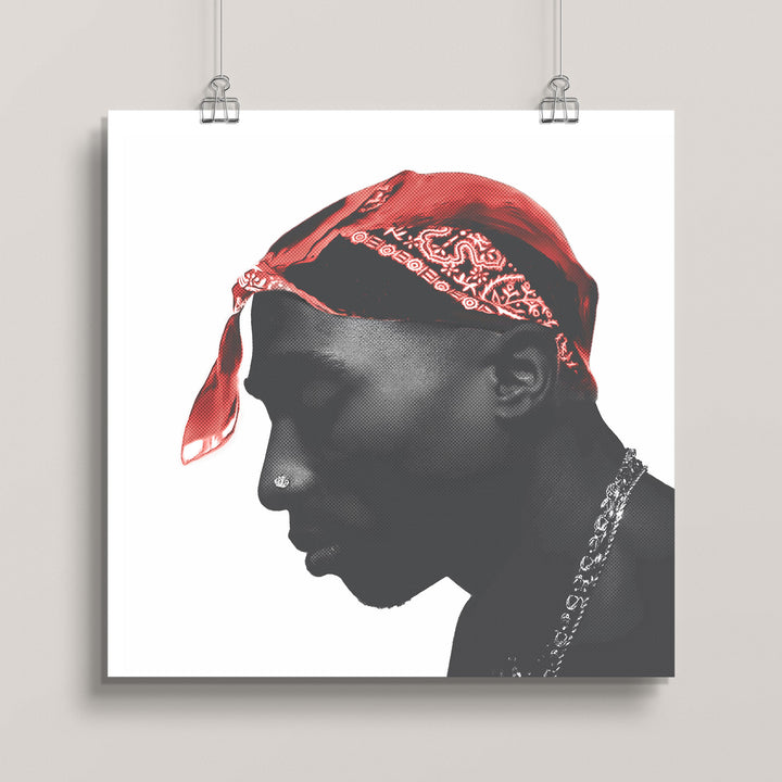 Honour the legacy of hip-hop’s greatest poet with this striking piece, capturing Tupac Shakur in a brooding pose. This portrait showcases his unmistakable presence, set against a clean white backdrop that lets his intensity shine. His signature red bandana adds the perfect pop of colour—symbolizing the passion, rebellion, and wisdom he carried throughout his life.