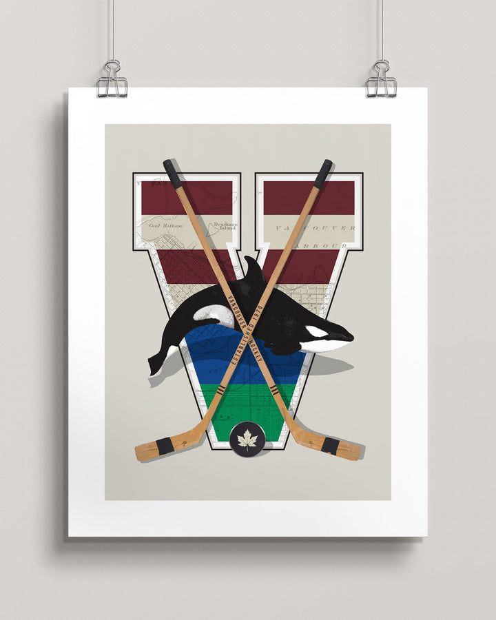This piece blends the rich histories of the 1911 Vancouver Millionaires with the post-1970 NHL era. The design features an illustration of an Orca—linking the spirit of hockey to the natural heritage of the Pacific Northwest. Alongside this, the artwork incorporates antique hockey sticks, a vintage map of Vancouver, and a stylized “V” inspired by the iconic Millionaires' logo.