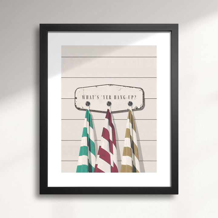 Every cottage has that one spot where towels should end up—but somehow never quite make it. What's Yer Hangup features a vintage tin sign turned towel rack, giving a not-so-gentle nudge to hang things up instead of leaving a soggy mess on the floor. With three classic towels swinging below, this print is a playful tribute to one of the great unsolved mysteries of cottage life.